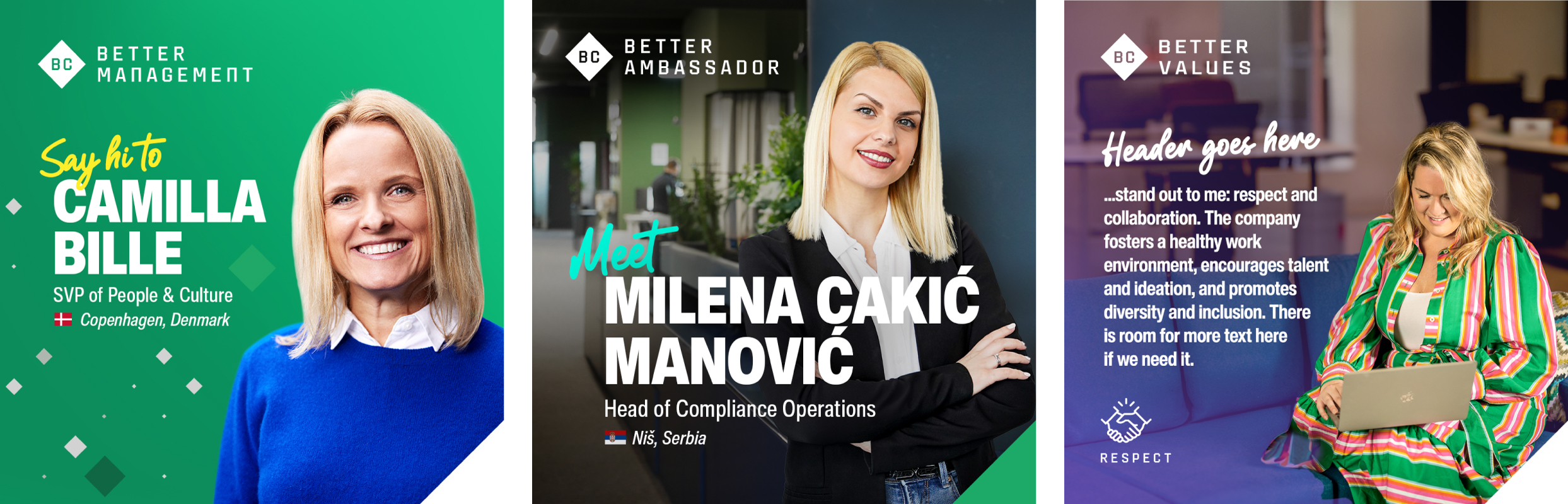 Recognising that talent and culture were a competitive advantage, I also developed a distinct employer branding system that communicated Better Collective’s values and talent story to global candidates. This included visual frameworks, messaging architecture, and flexible templating that supported growth hiring and recruitment marketing. To support the internal rollout - especially as teams grew to over 2,500 people across the world - I defined internal identities and guidelines, ensuring local teams could apply the brand consistently, regardless of geography or channel.